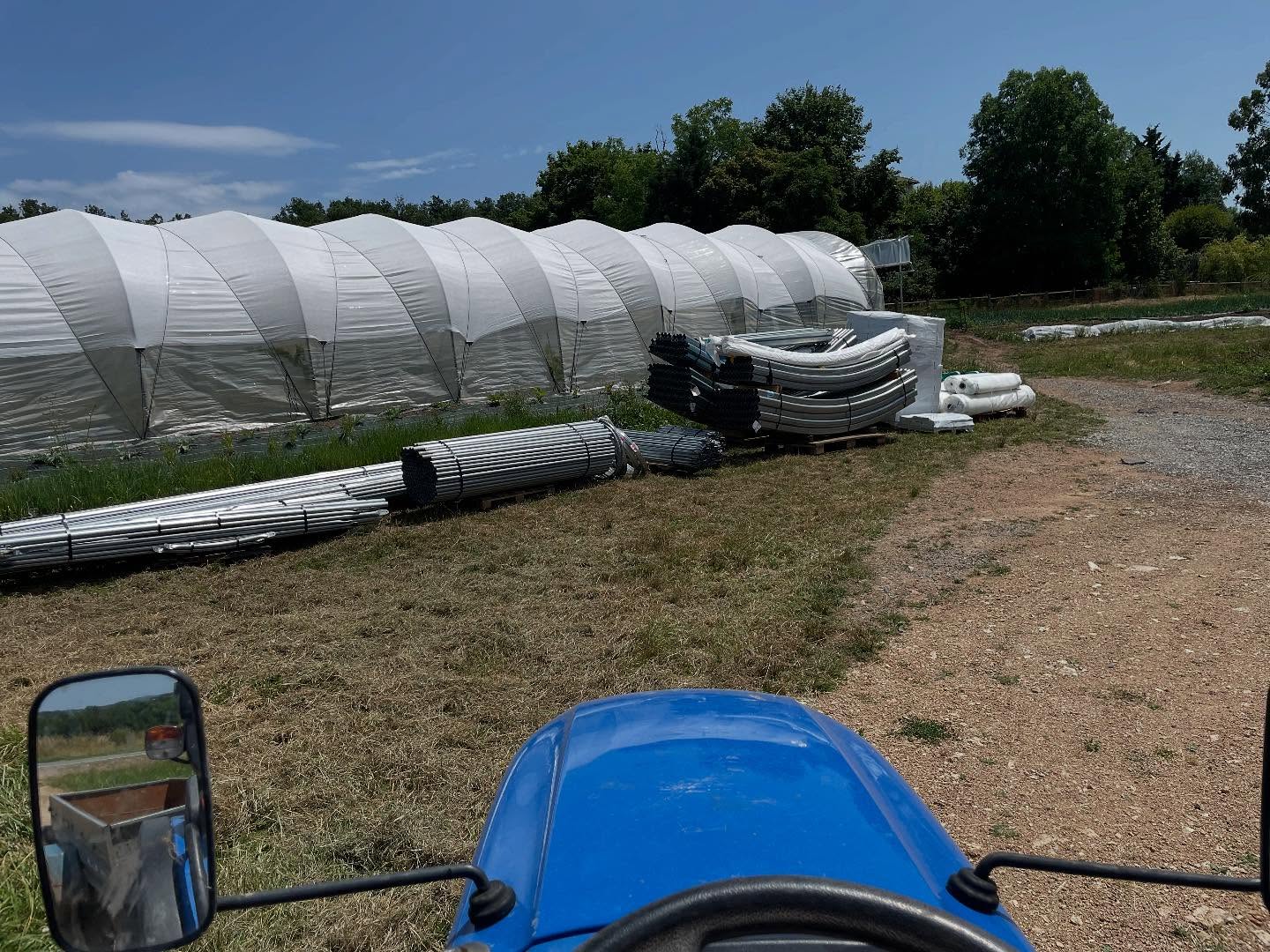 27/06/2025 – Réception du bi-tunnel qui devra être monté pour 2026. On augmente la surface de serre à 1200m2 ce qui va permettre de cultiver tout l’hiver et surtout faire face à la grêle les étés. Grosse cession montage en cours…