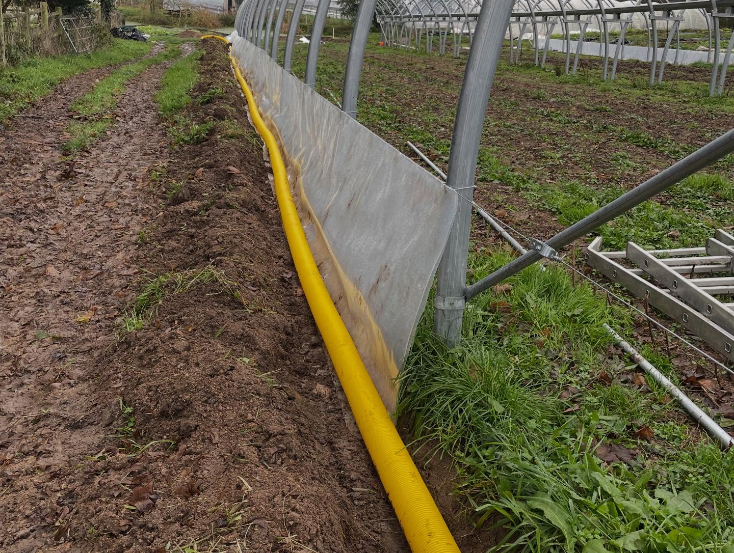 28/11/2025 – On termine d’acheminer l’eau de la serre et des cheneaux des bâtiments vers la mare. On attaque le bachage de la serre semaine prochaine. Les premiers semis seront faits semaine prochaine également pour les légumes primeurs de printemps.